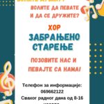 28.02.2025. „Забрањено старење“ – хор Дневних центара и клубова за старије стациониран у Светогорској 14, организује аудицију за пријем чланова. Аудиција је намењена свим сениорима који воле да певају и који желе да се баве културно-уметничким стваралаштвом. Хор стартује са новом поставком и са новом енергијом. „Забрањено старење“ је аматерски хор уз који ширимо поље културне размене са сродним удружењима, уз наступе на концертима, приредбама и прославама. Све то уз сјајна дружења и стицање нових познанстава.