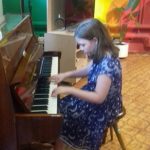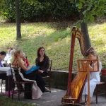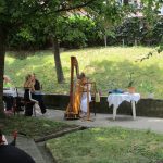 У прелепом амбијенту дворишта дома, харфисткиња Александра Првуловић у пратњи своје две ученице Миње и Лане, одржала је једночасовни концерт.